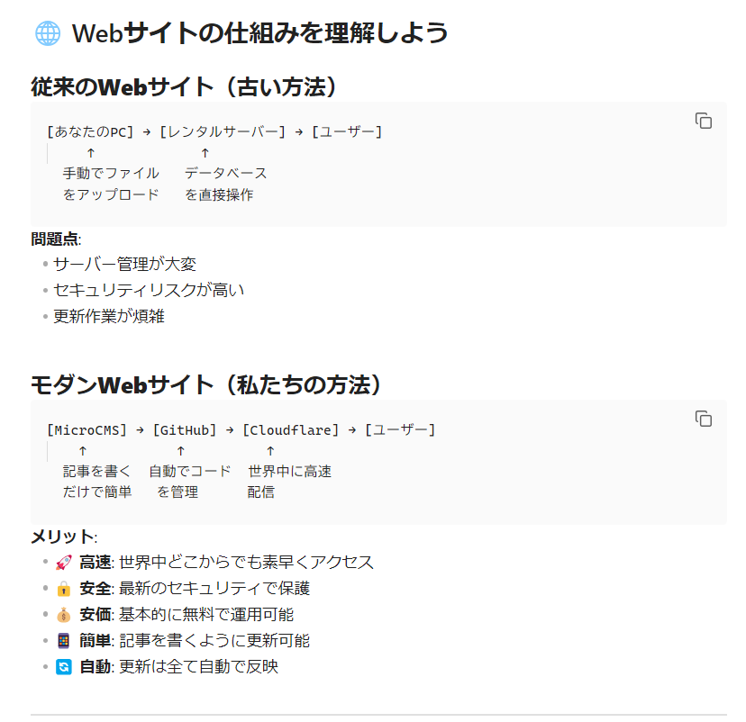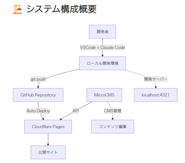 そこで、Claude Codeに初心者用のガイドラインを作るよう依頼しました。すると瞬く間に図3の初心者ガイドが作成され、これを読み込むことで、少しずつではありますがシステム構成の概略を掴むことができました。サイトのデザイン等はGitHubに置き、サイト内のコンテンツや記事をMicroCMSに掲載した後、CloudflarePagesでこれらを読み込みデプロイすると、インターネット上にサイトが公開される。そして、Webhookという仕組みを使えば、GitHubやMicroCMS内のデータが更新されたタイミングで自動的に再デプロイをさせることができる、と。