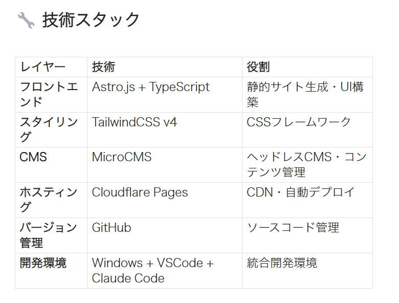 主にWeb検索を用いた情報収集を行ったところ、「Astro.jsによりテンプレートを作成し、Claudeflare Pagesでホスティング、microCMSで記事管理、GitHubで更新管理を行う」という方法に行きつき、Claude Codeに相談をし、レポートにまとめるよう指示しました。