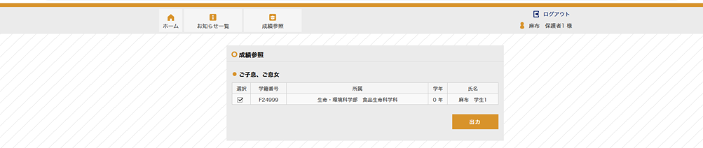 - 成績参照:学生の成績通知書をダウンロードすることが可能(レイアウトは職員が印刷するデータに準拠)