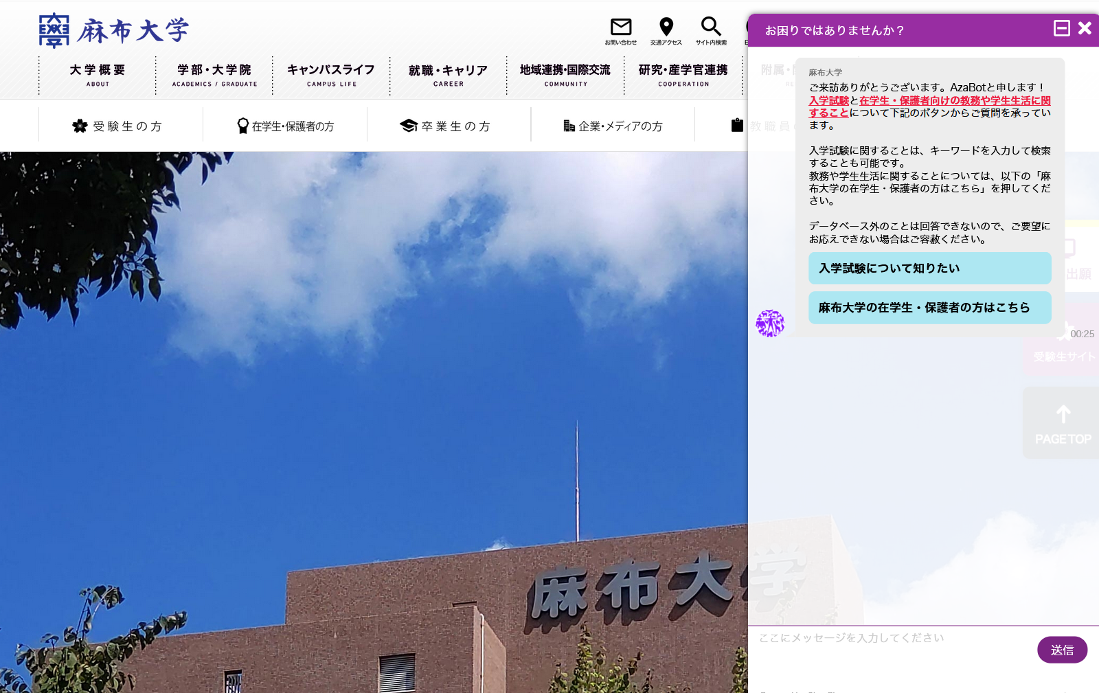 AzaBotは大学公式ホームページから簡単にアクセスできます。質問を入力するだけで、AzaBotが回答を瞬時に提供します。