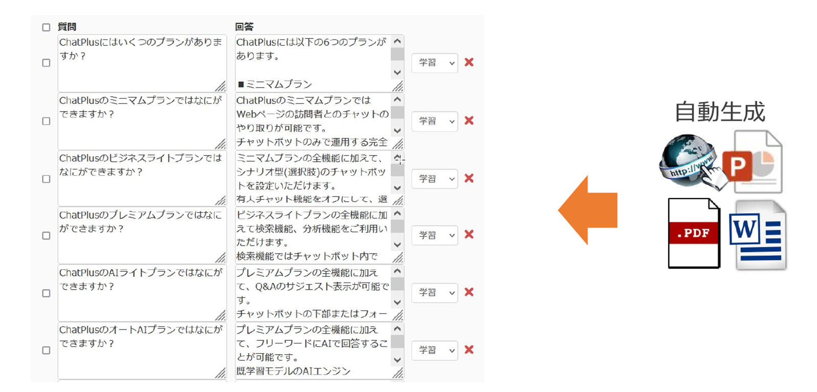 - 自動QA生成: PDF、Word、PowerPointファイルから自動的にQ&Aペアを生成
